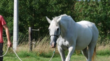 You can train your horse on a single lunge (lunging), but you can also use 2 lunges. This is called “double lunging”. When you use a double lunge, you stay in the circle position (the horse moves around..
