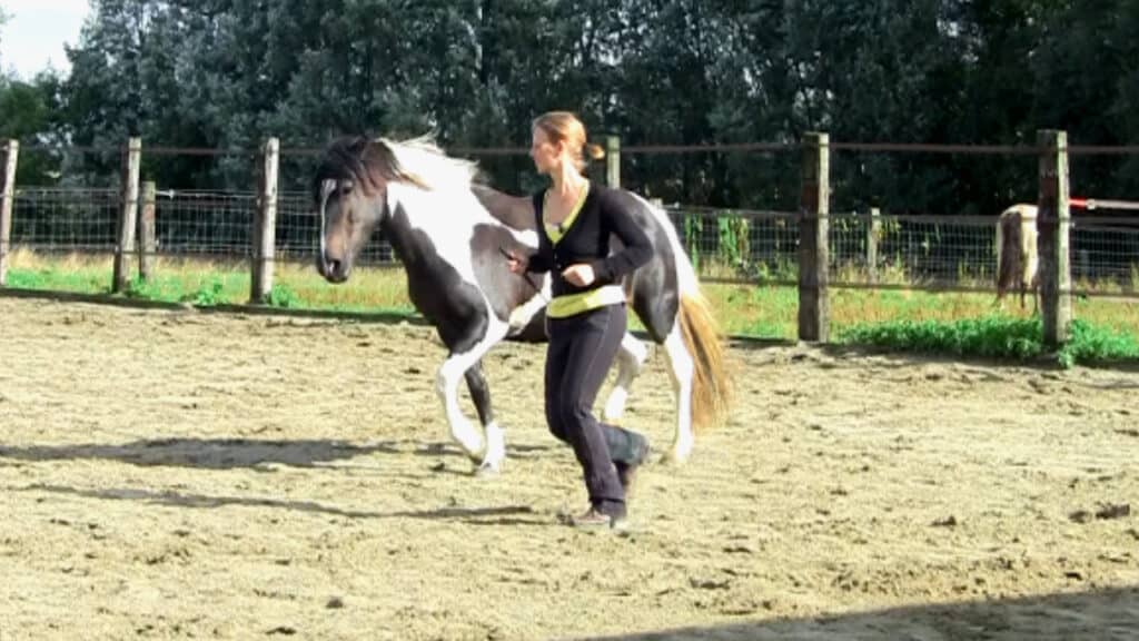 Then you can decide the speed and direction, and the horse will stay with you and adapt his speed and direction to you. By doing this exercise, you learn to show confident and calm leadership.